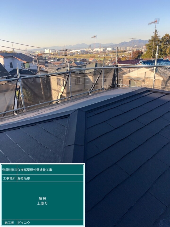 上塗りをしています。上塗りとは、塗装の仕上げの工程です。塗装における仕上げ工程で、外壁塗装の最終段階に行う作業 を指します。 塗料は、 中塗りと同じものを使用することが一般的 です。 ムラ・気泡を覆い隠す 、雨風や汚れから 外壁を守る などの役割を果たしています。