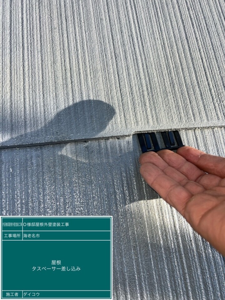 タスペーサーが必要になるのは、画像のようなスレート屋根の塗装をする場合です。屋根は、屋根材と屋根材の間に適切な隙間と通気性を確保することで、雨漏りの原因である雨水の浸入を防ぐことができます。隙間を確保する作業を「縁切り」といいますが、縁切りは、塗装工程の後、塗料が乾くのを待ってカッターや皮スキなどで行います。 「タスペーサー」を用いた「タスペーサー工法」は、塗装工程の前に屋根材と屋根材の重なっている部分に挿入し、適切な隙間と通気性を確保するため、塗装工程後の「縁切り」作業が必要ありません。