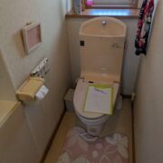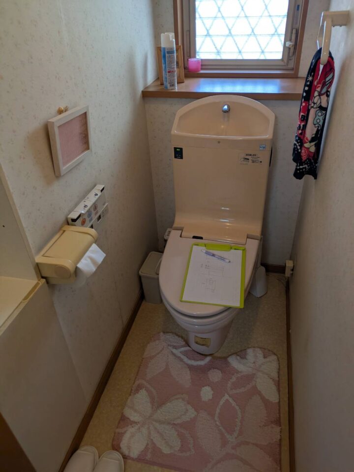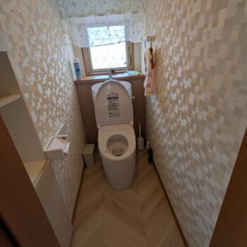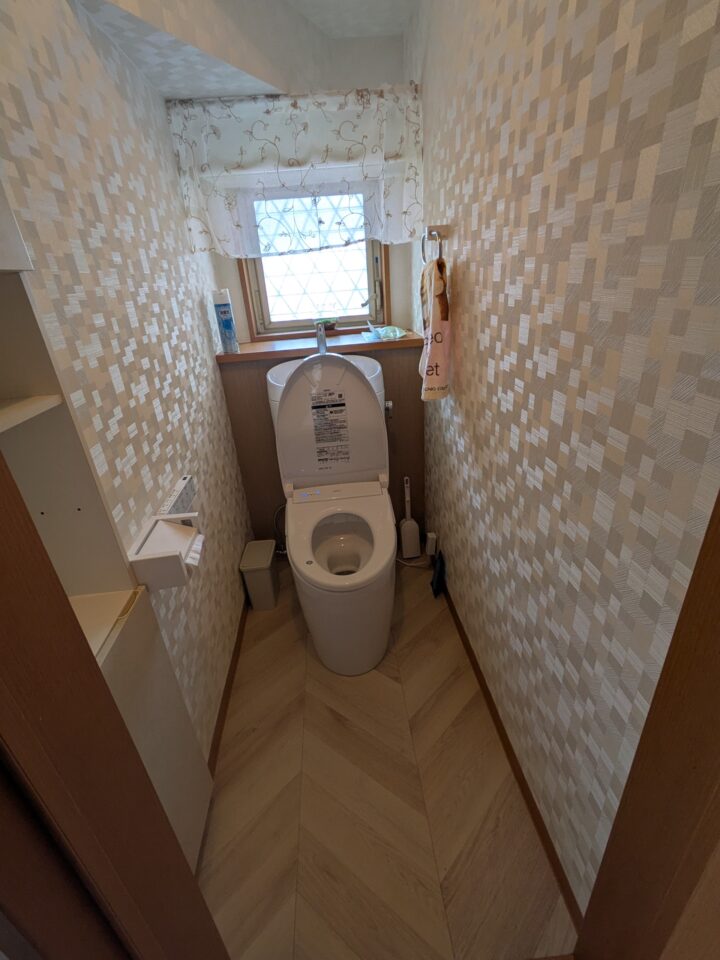 TOTO ピュアレスト EX 丸みのあるタンクデザインと、給水・給電の配管見えを抑えた設計で空間が整います。クロスもクッションフロアも新築のように素敵ですね。