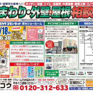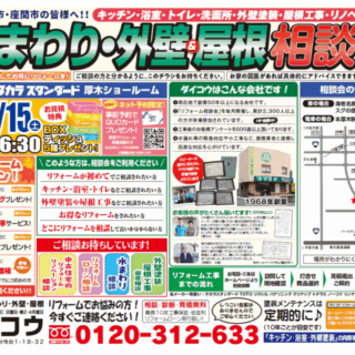 【リフォーム相談会のお知らせ】イベント詳細 【お問合せ ダイコウ0120-312-633】≪メイン会場≫ タカラスタンダード厚木ショールーム 厚木市岡田1-3-5 https://www.takara-standard.co.jp/showroom_search/kanagawa/atsugi/ ※駐車場17台有り/展示品多数有り!≪サブ会場≫ ダイコウ店舗 海老名市国分寺台1-18-32 https://・・・