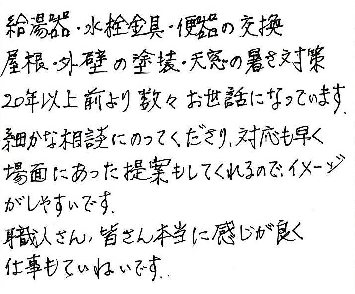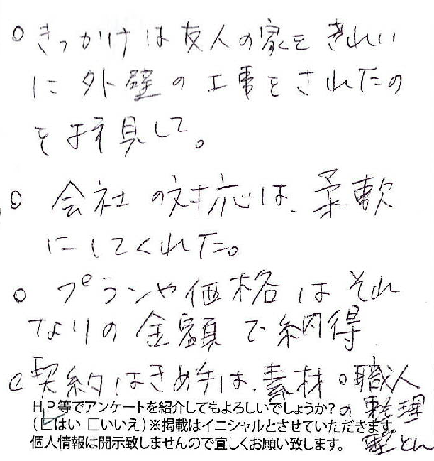 ・きっかけは友人の家をきれいに外壁の工事をされたのを拝見して。・会社の対応は、柔軟にしてくれた。・プランや価格はそれなりの金額で納得。・契約はきめ手は素材。・職人の整理整とん
