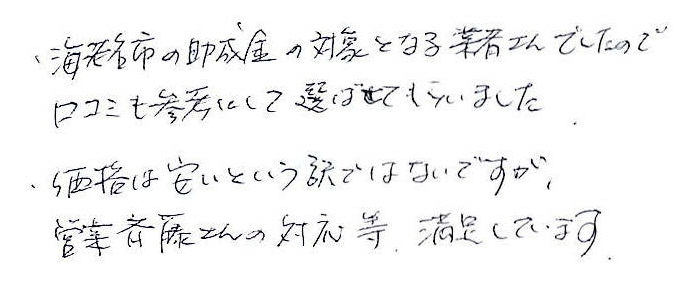 海老名市の助成金の対象となる業者さんでしたので、口コミも参考にして選ばせてもらいました。価格は安いという訳ではないですが、営業斉藤さんの対応等、満足しています。
