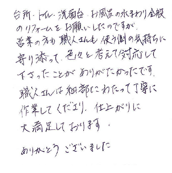台所・トイレ・洗面台・お風呂の水まわり全般のリフォームをお願いしたのですが、営業の方も職人さんも使う側の気持ちに寄り添って、色々と考えて対応して下さったことがありがたかったです。職人さんは細部にわたって丁寧に作業してくださり、仕上がりに大満足しております。ありがとうございました