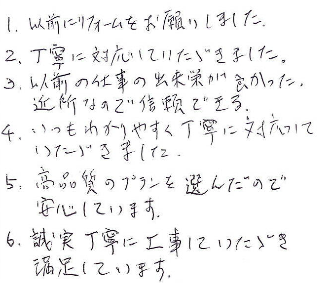 「誠実丁寧に工事していただき満足しています」屋根外壁塗装リフォーム/海老名市T様 No.610・2026年2月4日更新 1.(きっかけは)以前にリフォームをお願いしました。2.(営業の対応は)丁寧に対応していただきました。3.(きめ手は)以前の仕事の出来栄が良かった。近所なので信頼できる。4.(会社の対応は)いつもわかりやすく丁寧に対応していただきました。5.(プランや価格は)高品質のプランを選んだので安心しています。6.(職人や工事は)誠実丁寧に工事していただき満足しています。