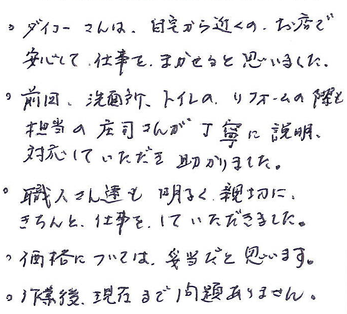 「職人さん達も明るく親切に、きちんと仕事をしていただきました」屋根外壁塗装リフォーム/海老名市S様 No.611・2026年2月4日更新 ・ダイコーさんは、自宅から近くのお店で安心して仕事をまかせると思いました。・前回、洗面所、トイレのリフォームの際も担当の庄司さんが丁寧に説明、対応していただき助かりました。・職人さん達も明るく親切に、きちんと仕事をしていただきました。・価格については妥当だと思います。・作業後、現在まで問題ありません。
