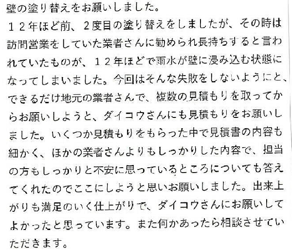 外壁塗装をどこの会社にお願いしようかネットで探していたところ、ダイコウさんのHPを見つけました。長く地元でお仕事をされているとの事なので、一度相談させて貰おうと思ったことがきっかけでした。家の前の道路も土地が広くなかったので足場や塗装の最中に近所の方達に迷惑をかけてしまわないかが一番心配している点でしたが、打つ合わせで適切な案を提案して頂けてスムーズに工事を終える事ができました。初めての事でしたのでわからない事だらけでしたが、ダイコウさんにお願いして良かったです。ありがとうございました。
