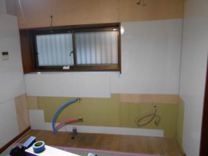 既存のキッチンを撤去して、下地や配管を整えます。
